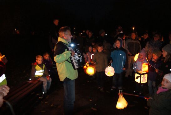 alle auf dem Spielplatz Schafgabenweg versammelt hatten und die Laternen / Fackeln brannten, zog Michael Robotta von der